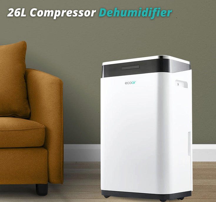 Le déshumidificateur EcoAir DC26, avec une capacité de déshumidification allant jusqu'à 26 litres d'eau par jour, est une classe à part en termes de performances, de possibilités de réglage et de commande. Son indicateur d'humidité de l'air se colore en bleu lorsque le taux d'humidité est faible (< 45 % HR), en vert lorsque le taux d'humidité est correct (45 - 65 % HR) et en rouge lorsque le taux d'humidité est élevé (> 65 % HR). L'EcoAir DC26 est équipé d'un hygromètre numérique, d'un filtre à charbon pour éliminer les odeurs désagréables et d'un grand réservoir d'eau de 6,5 litres. Il est également possible d'évacuer l'eau directement à l'aide d'un tuyau d'évacuation, il suffit de raccorder le tuyau fourni.