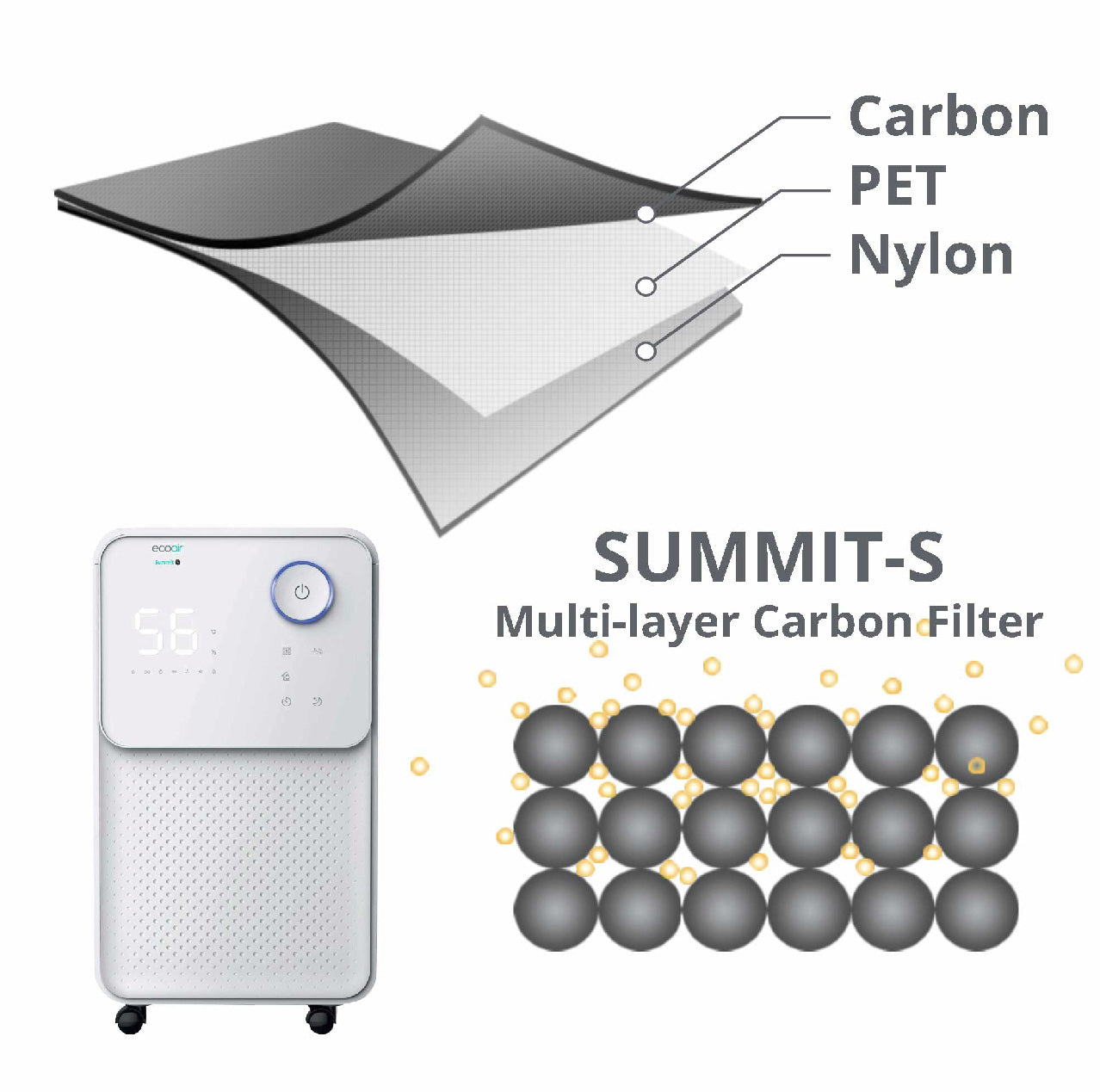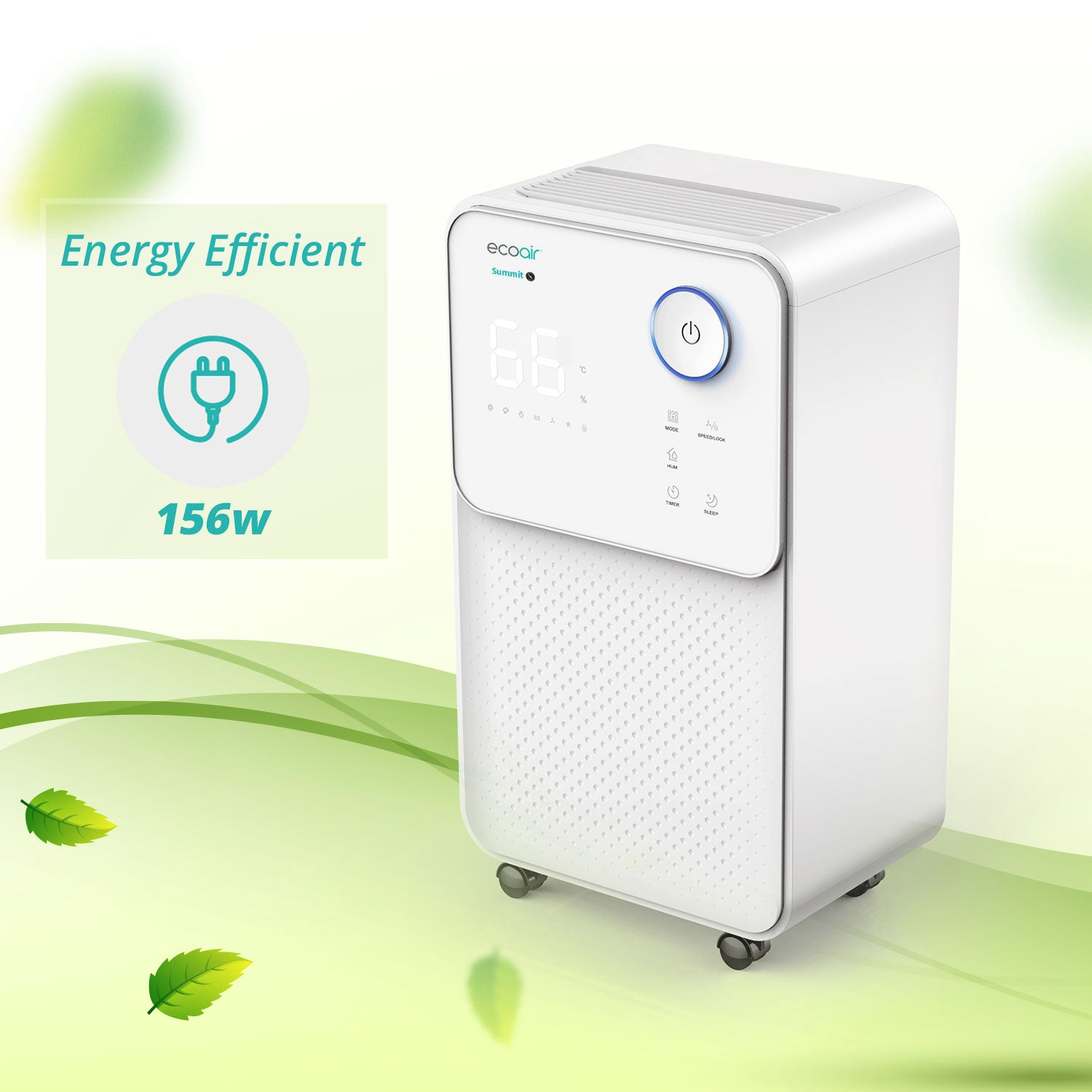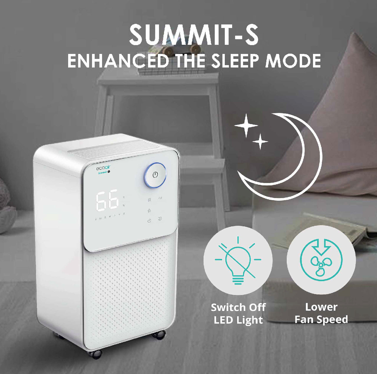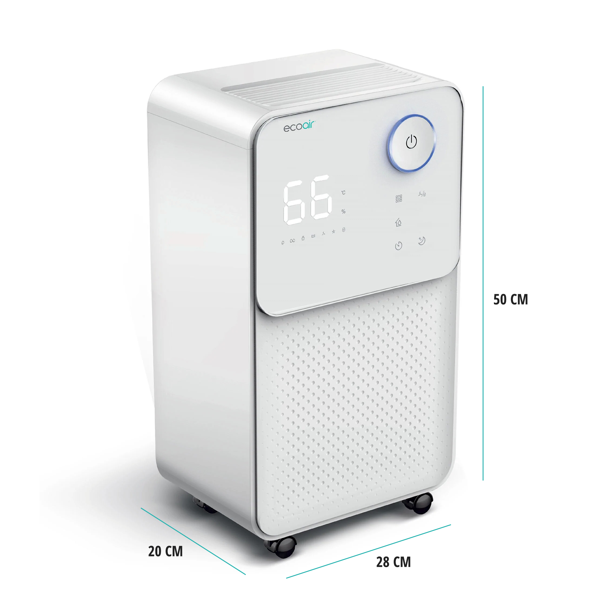 L'EcoAir Summit-S est un déshumidificateur élégant et économe en énergie. Il affiche clairement le taux d'humidité sur son grand écran. Le Summit-S peut éliminer jusqu'à 12 litres d'eau par jour. Grâce à son filtre à charbon à 3 couches, son filtre PET (polyéthylène téréphtalate) et son filtre à poussière, ce petit déshumidificateur purifie également l'air. La combinaison d'un déshumidificateur et d'un purificateur d'air est idéale pour obtenir un environnement intérieur agréable. Finis l'humidité et les odeurs désagréables.